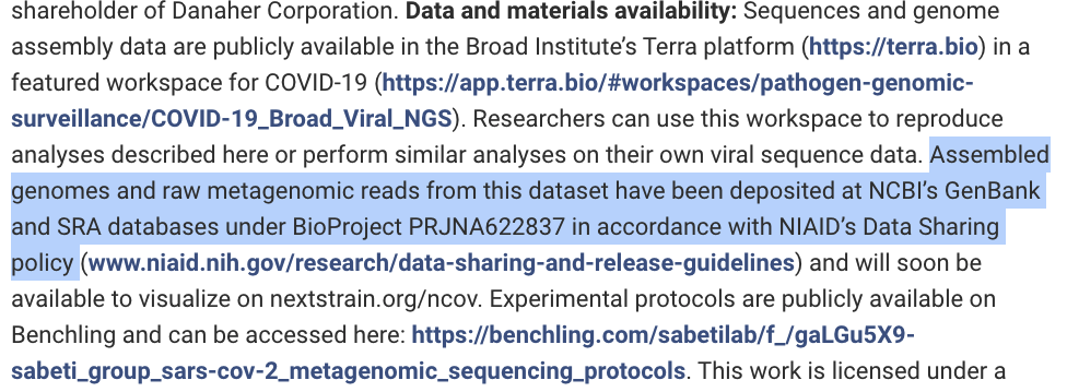 First we need to identify some samples of interest. The Sequence Read Archive (SRA) is the primary archive of unassembled reads operated by the US National Institutes of Health (NIH). SRA is a great place to get the sequencing data that underlie publications and studies. We know where to find the data because Science (and in fact, most publications) require authors to deposit their data in a public database and give us the information we need to find it on the database.